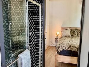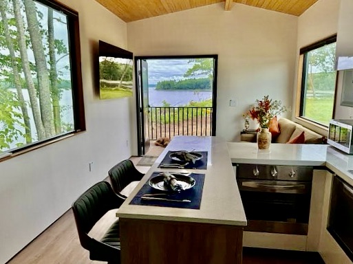 Our best selling and surprisingly spacious, ‘Clever 1 385’ 1 Bedroom Tiny House with Covered Deck, has everything you need. A separate Bedroom, Living Room and 12 feet long Quartz Countertop Kitchen with moveable Island. A full size Bath and Shower, space for a Queen size bed. Cathedral ceilings, massive windows and tons of modern amenities. Quality finishings and high-end design, leave even the largest homes jealous. All in 385 square feet.